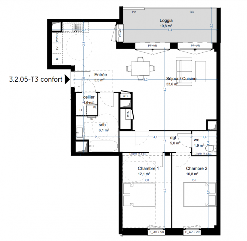 328 999€ Appt. T3 65m2 9ème