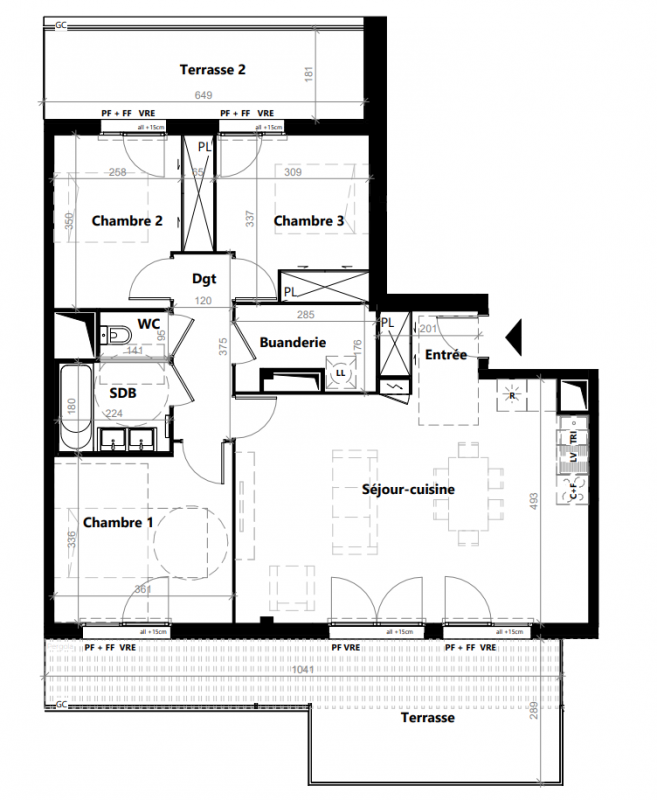 - T4 et T5 en attique avec grandes terrasses (jusqu'à 70 m²) : clientèle familiale urbaine et CSP+.